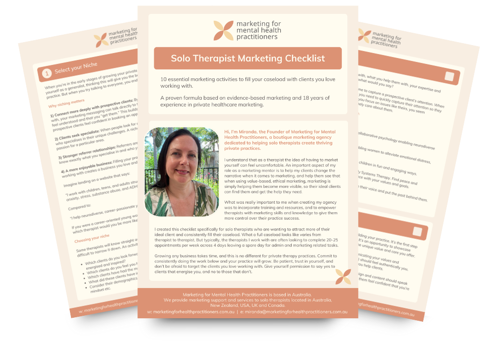 At Marketing for Mental Health Practitioners, we don't just do your marketing; we help you understand it. Our goal is to make high-quality, ethical marketing accessible to solo therapists while empowering you with the knowledge, skills and confidence to attract your ideal clients and build a thriving practice.